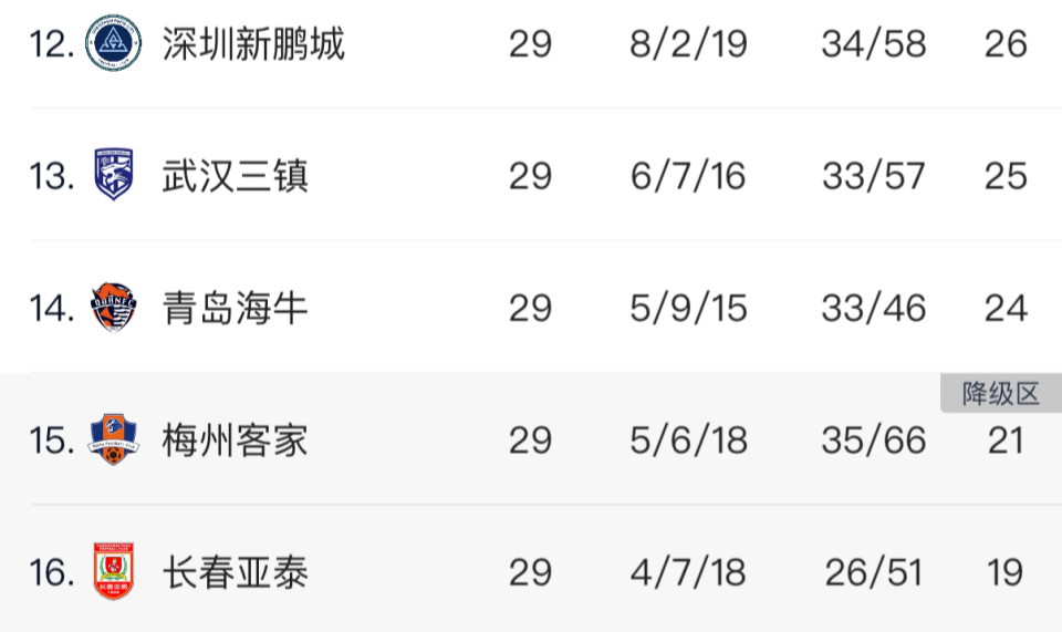 本轮过后,深圳新鹏城、武汉三镇已经提前上岸,而长春亚泰则提前降级。中超最后1个保级席位,将在青岛海牛和梅州客家之间展开。